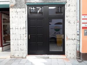 Vchodové dveře – vyrábíme v profilech IV68 až IV88mm. Profily IV78 a IV88 jsou vyráběny s trojsklem/izolační výplní a jsou vhodné pro zateplené a energeticky úsporné instalace. Vzhled dveří, tvar a členění dle přání zákazníka a technických možností.